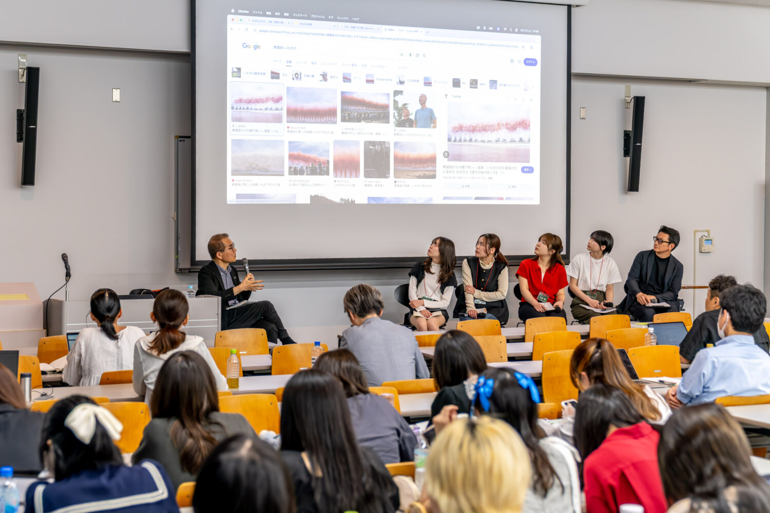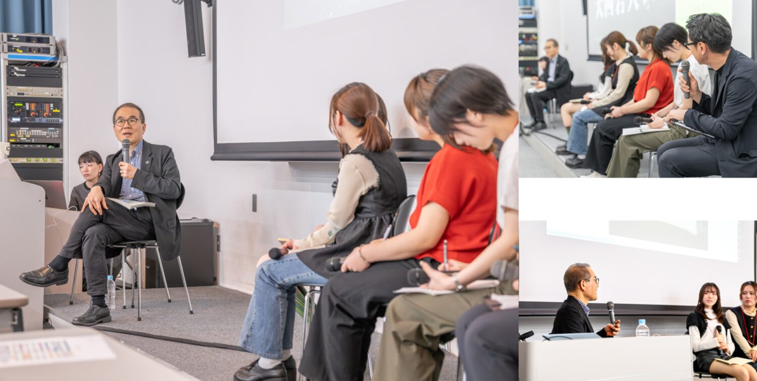 後半は学生とのトークセッションが行われました。世界の第一線で活躍する方がどのような視点と思想で社会と向き合っているのかを直接伺えるのは、学生にとって貴重な機会です。一方で、学生側が意図する答えを引き出せるかどうかは、ある意味で真剣勝負でもあります。取材における着眼点や心構えについて問われた際、大西先生が「事前の情報に頼らず、第一印象を大事にする」と答えられたのが印象的でした。「情報を先にインプットしてしまうと、主催者や制作者の意図した見方に誘導されてしまう。建築も同じで、写真だけで見るより、30秒でもいいから実際に建築を体感すべきだ」とのお言葉は、本学が学生に最も伝えたいことと重なり、感性はアートや建築と物理的に向き合うことで磨かれるのだと改めて示していただきました。