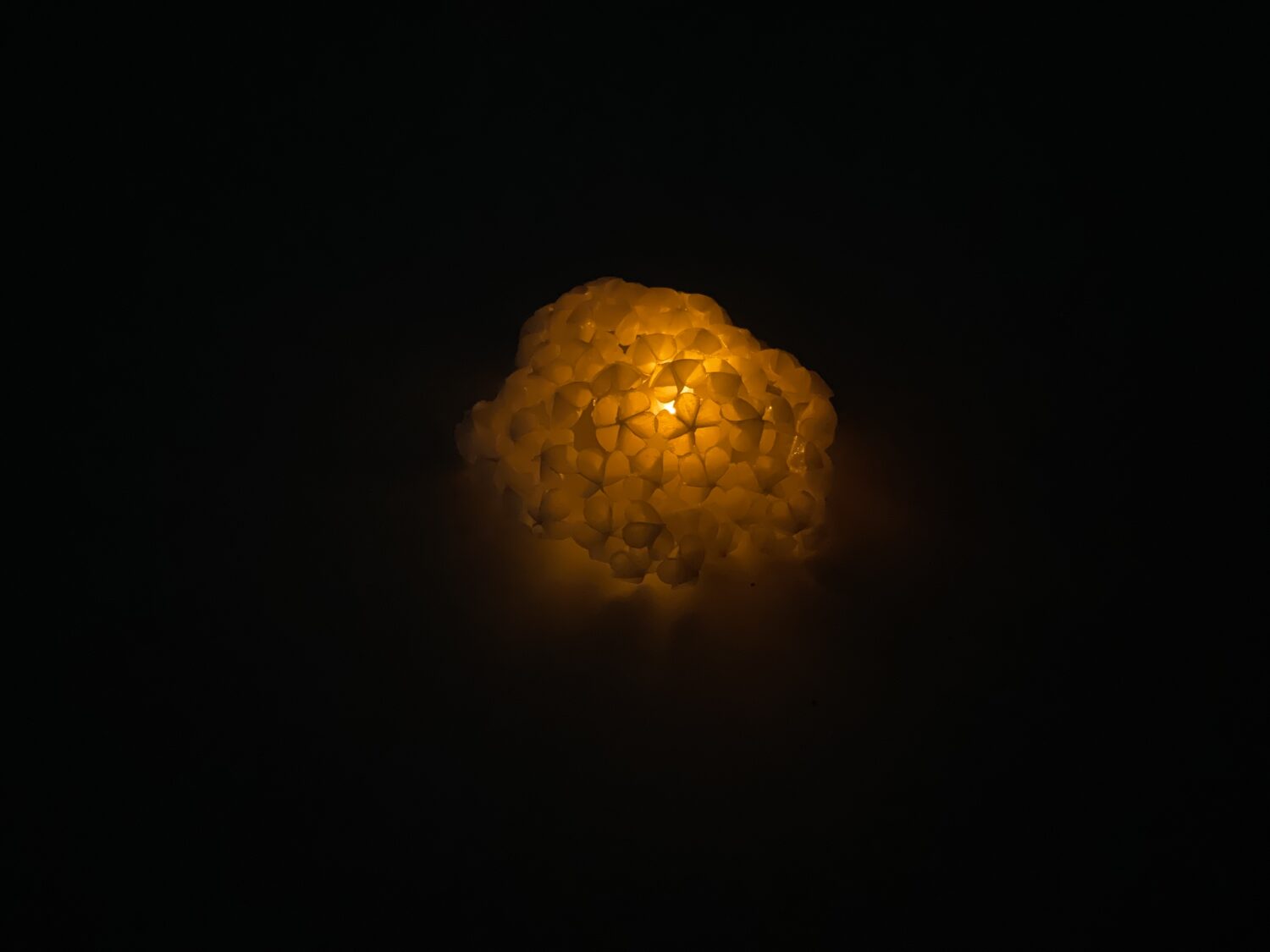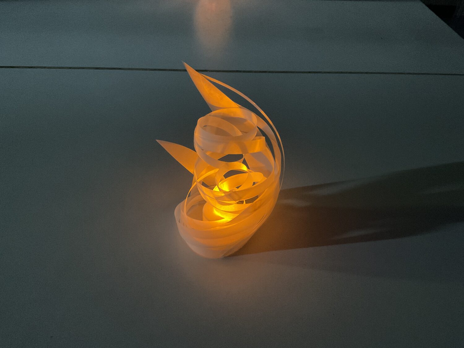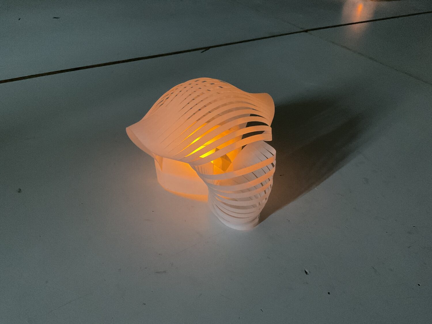 紙立体と光(LEDランタン)と組み合わせによる照明器具(ランプシェード)を作ります。 自分の表現したい灯りを「・・・の灯り」と抽象的なキーワードで定義し、具体的なランプシェードとして表現してます。 「優しい灯り」「温かい灯り」「美しい灯り」等など、LEDランタンとWトレス紙の素材特性を活かし、 光の効果と光の効果とカタチの関係を探る。