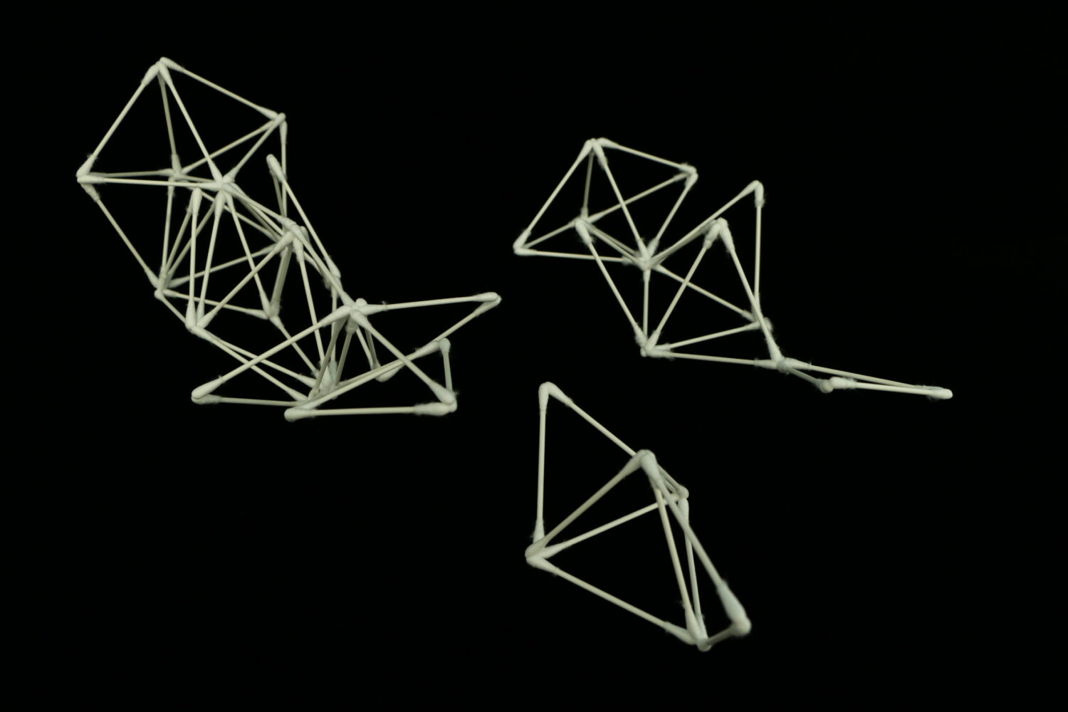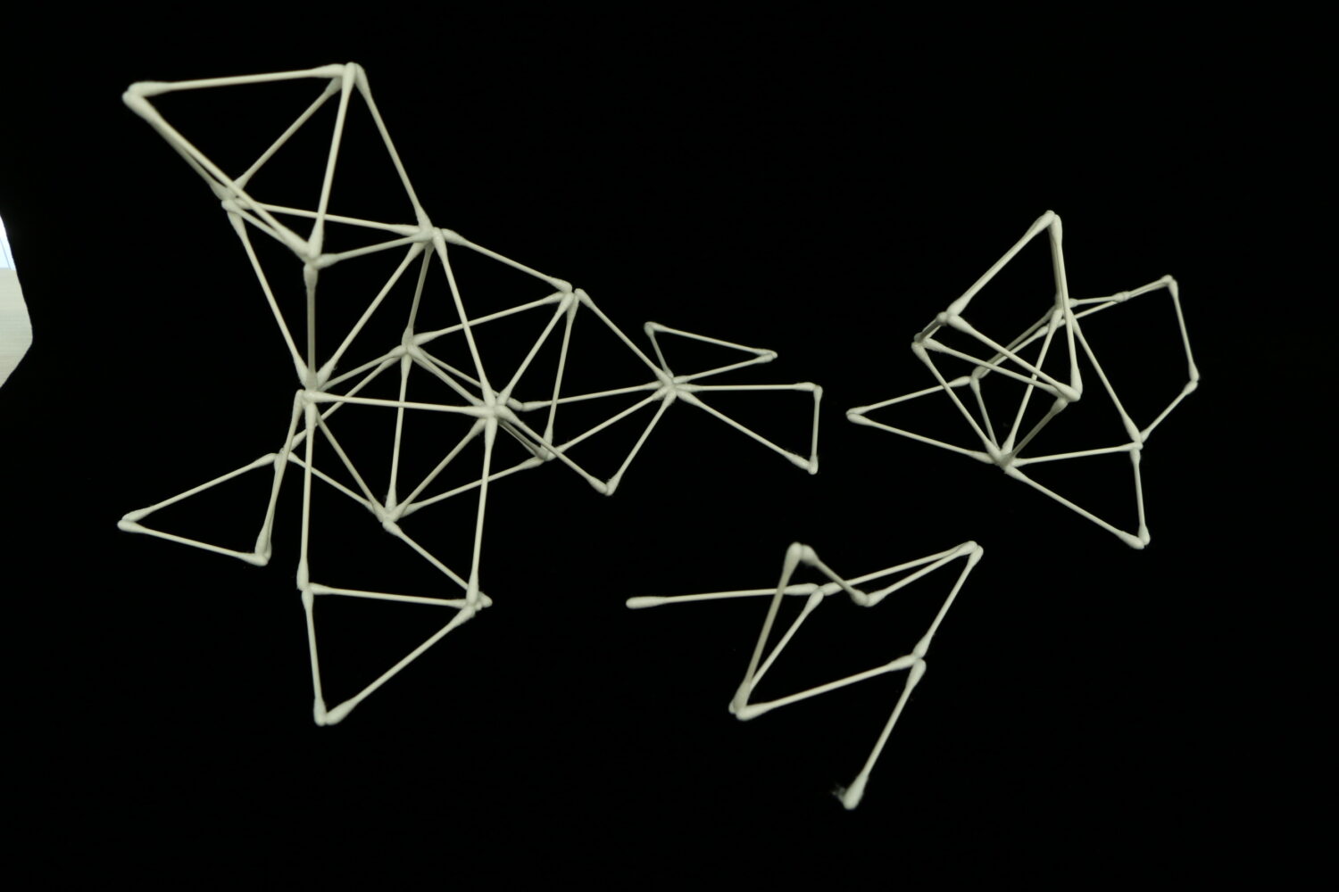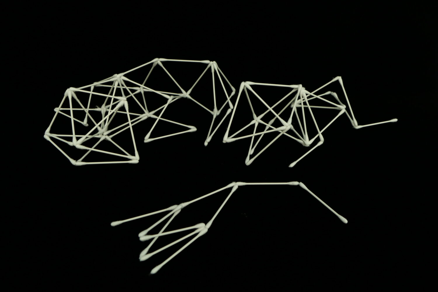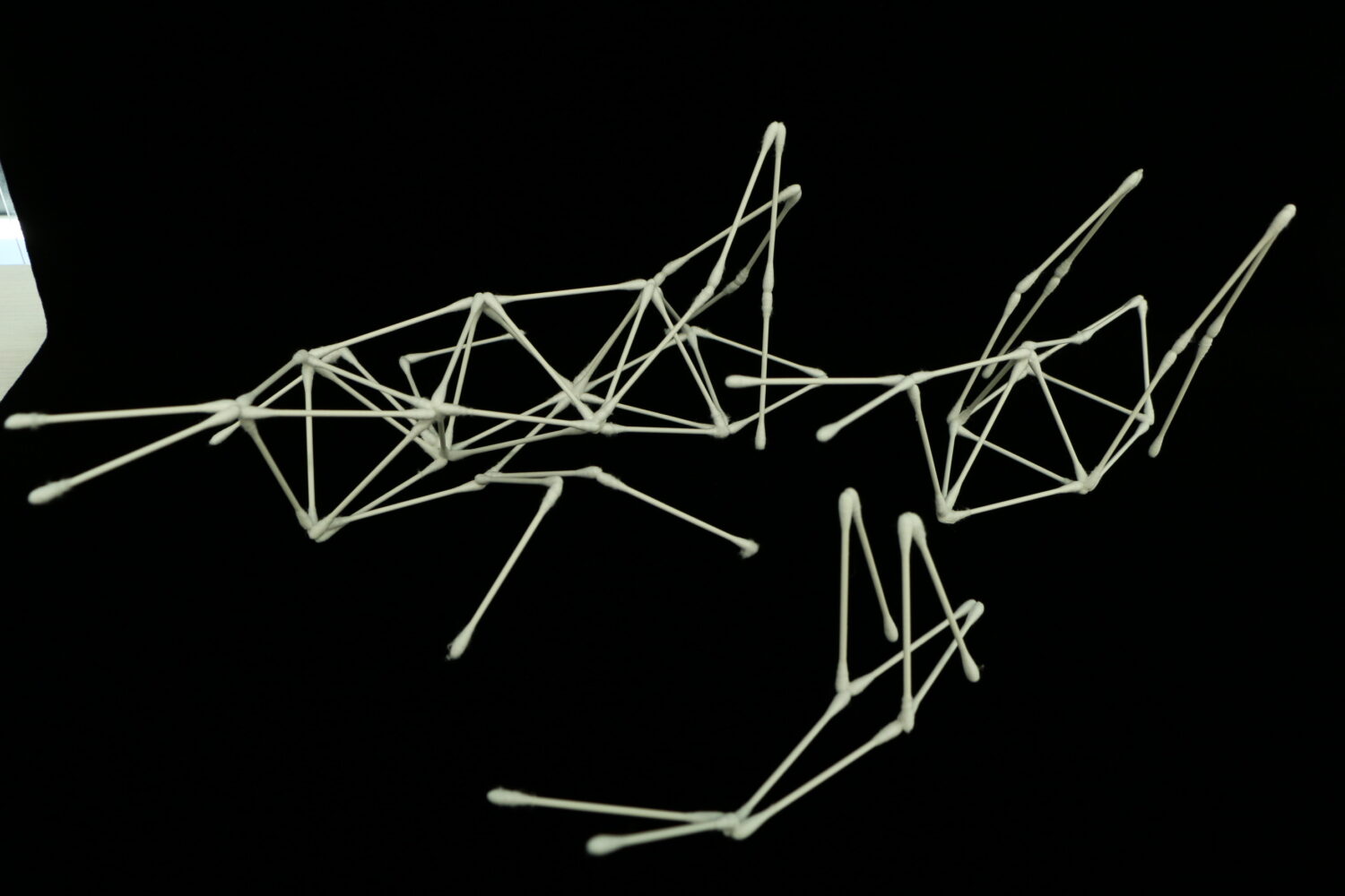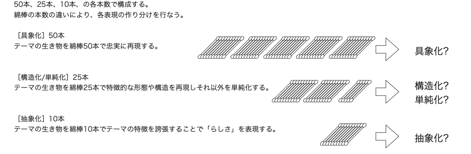 線による構成 生き物を綿棒で構成し、単純化と抽象化とは何かを学んで行きます。 線材(直線)である綿棒を組み合わせて、曲面である生き物をそれぞれ50本、25本、10本の綿棒を使用して再現しています。
