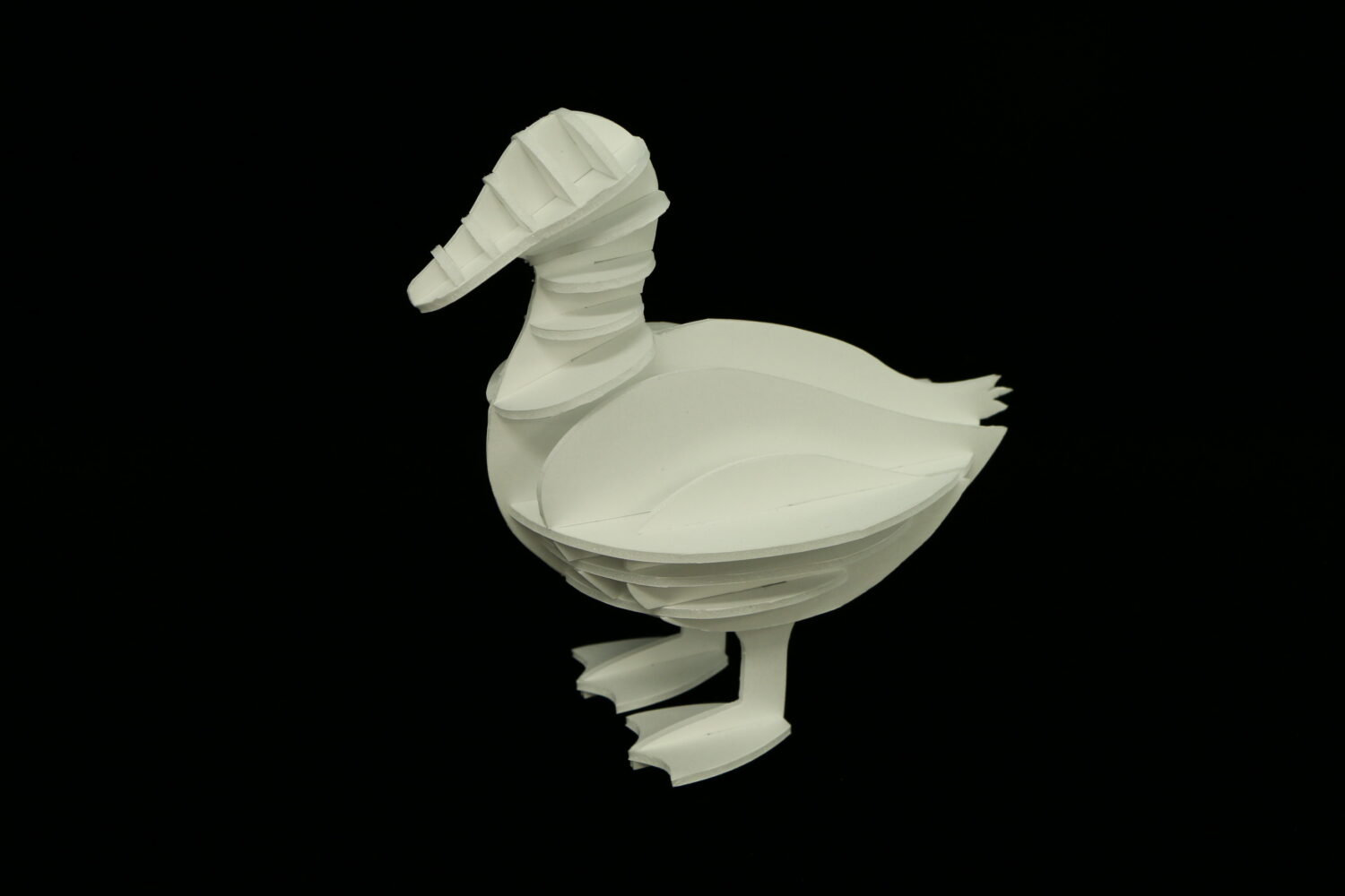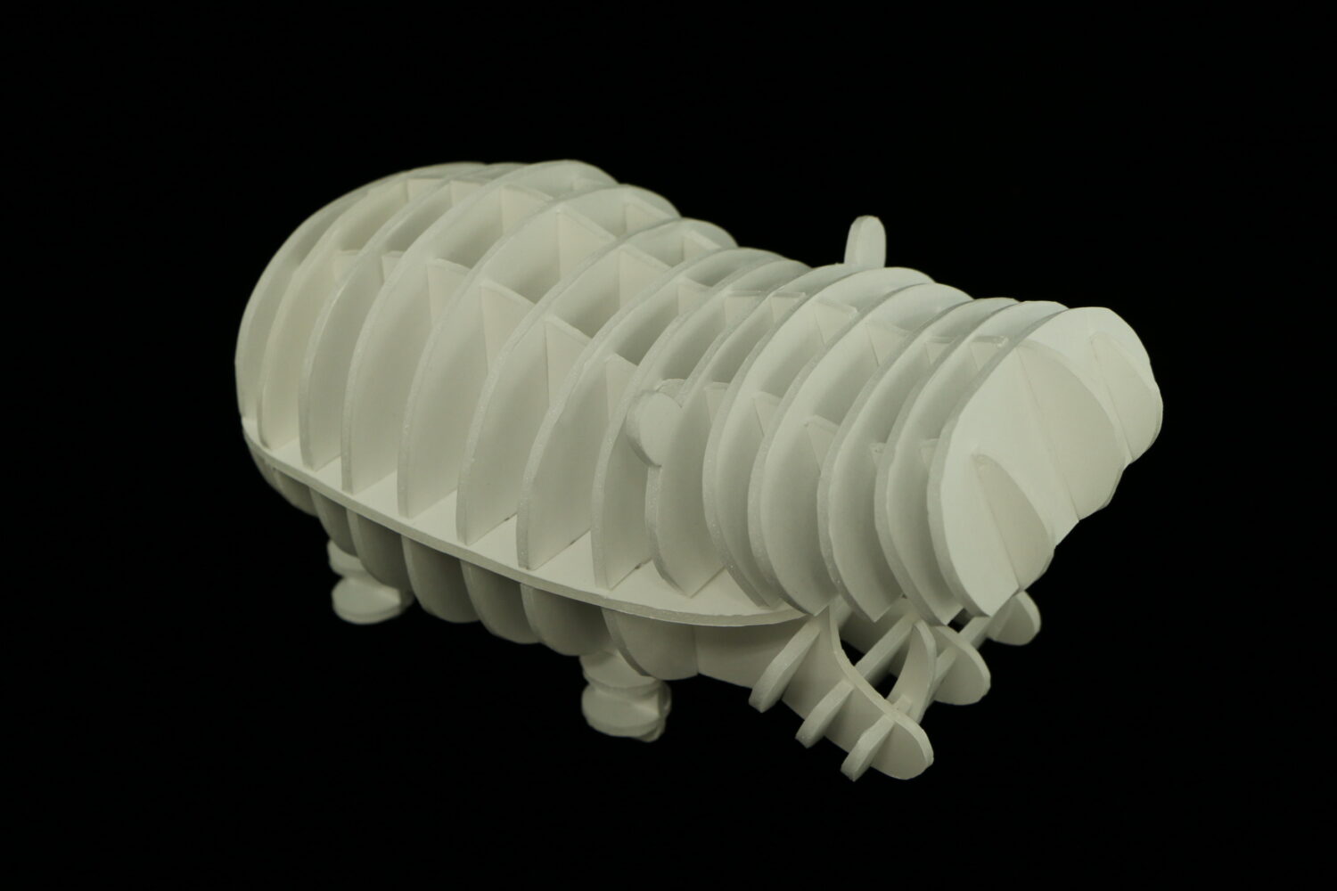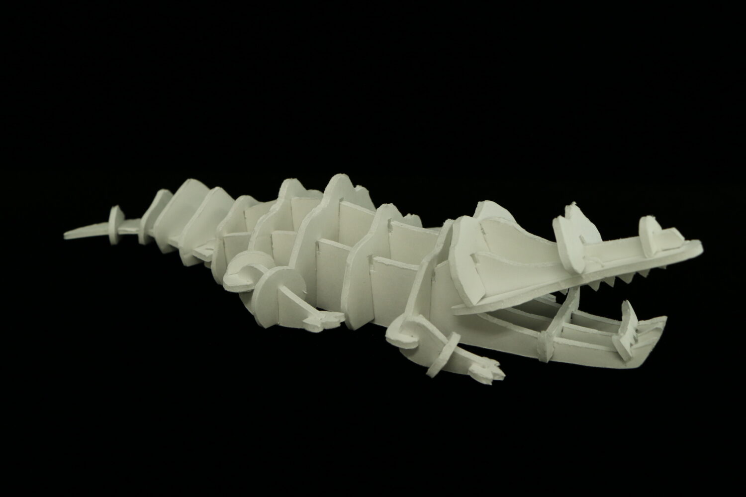 生き物の形態の特徴を面材(スチレンボード)を使い立体的に構成しました。 材料・道具:スチレンボード、カッター