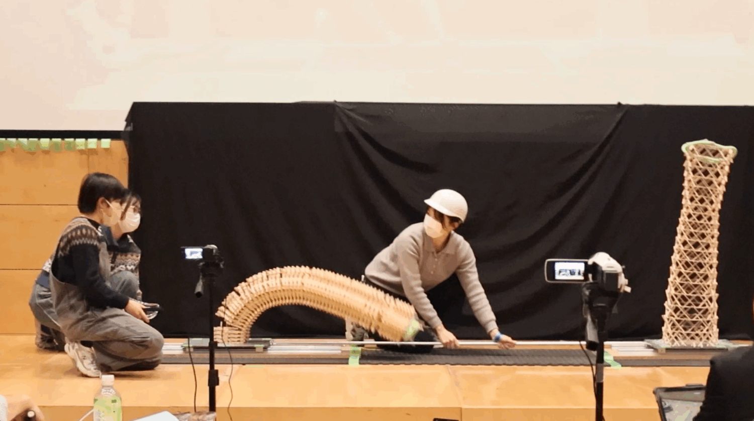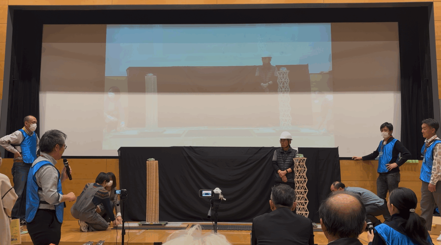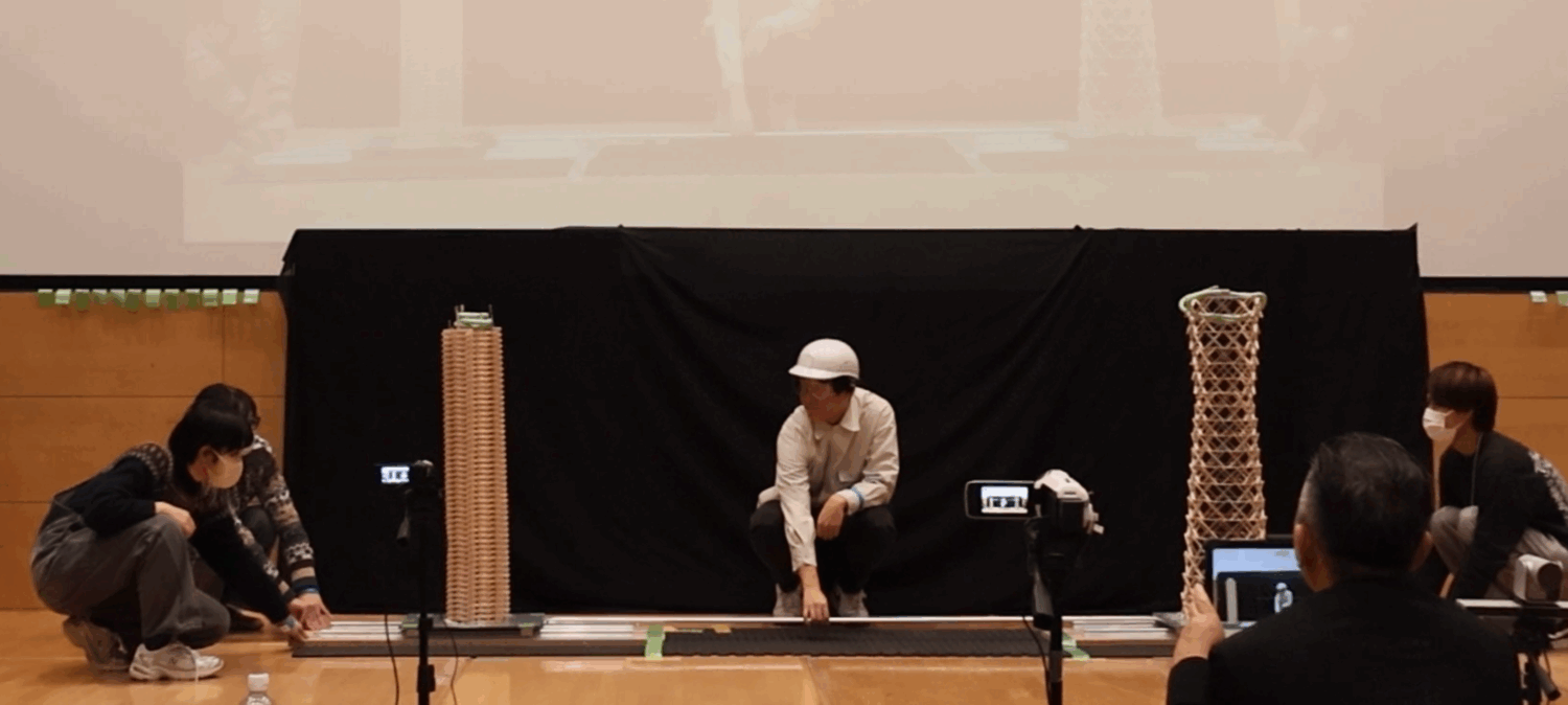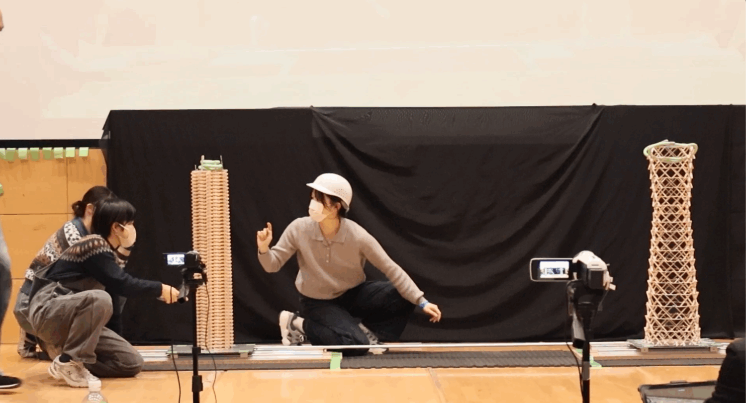 この模型を対戦相手と同じ振動台の上に載せて15秒間揺らし、耐えることができるかを比べます。1回耐えられたら、揺らす人を変えてもう一度15秒間揺らします。