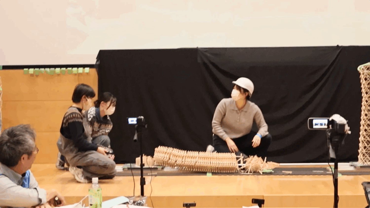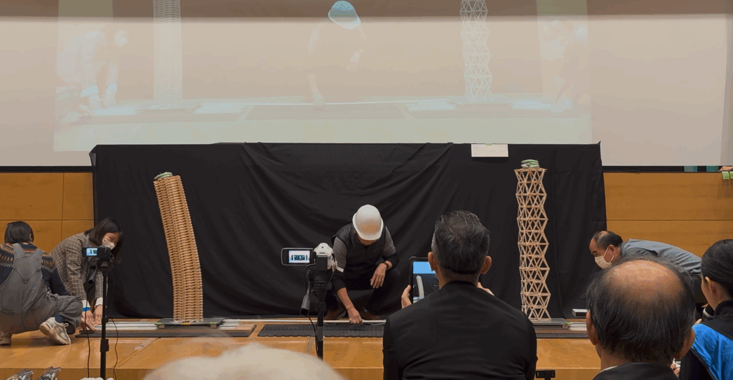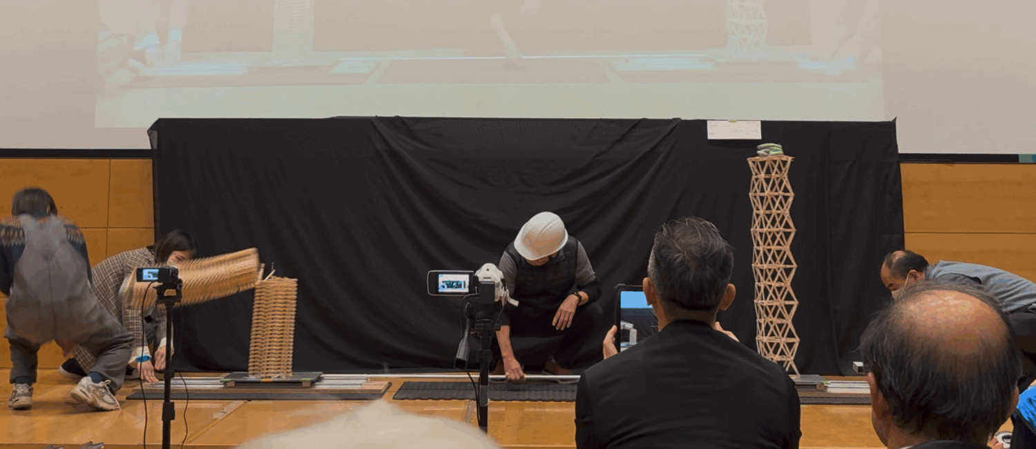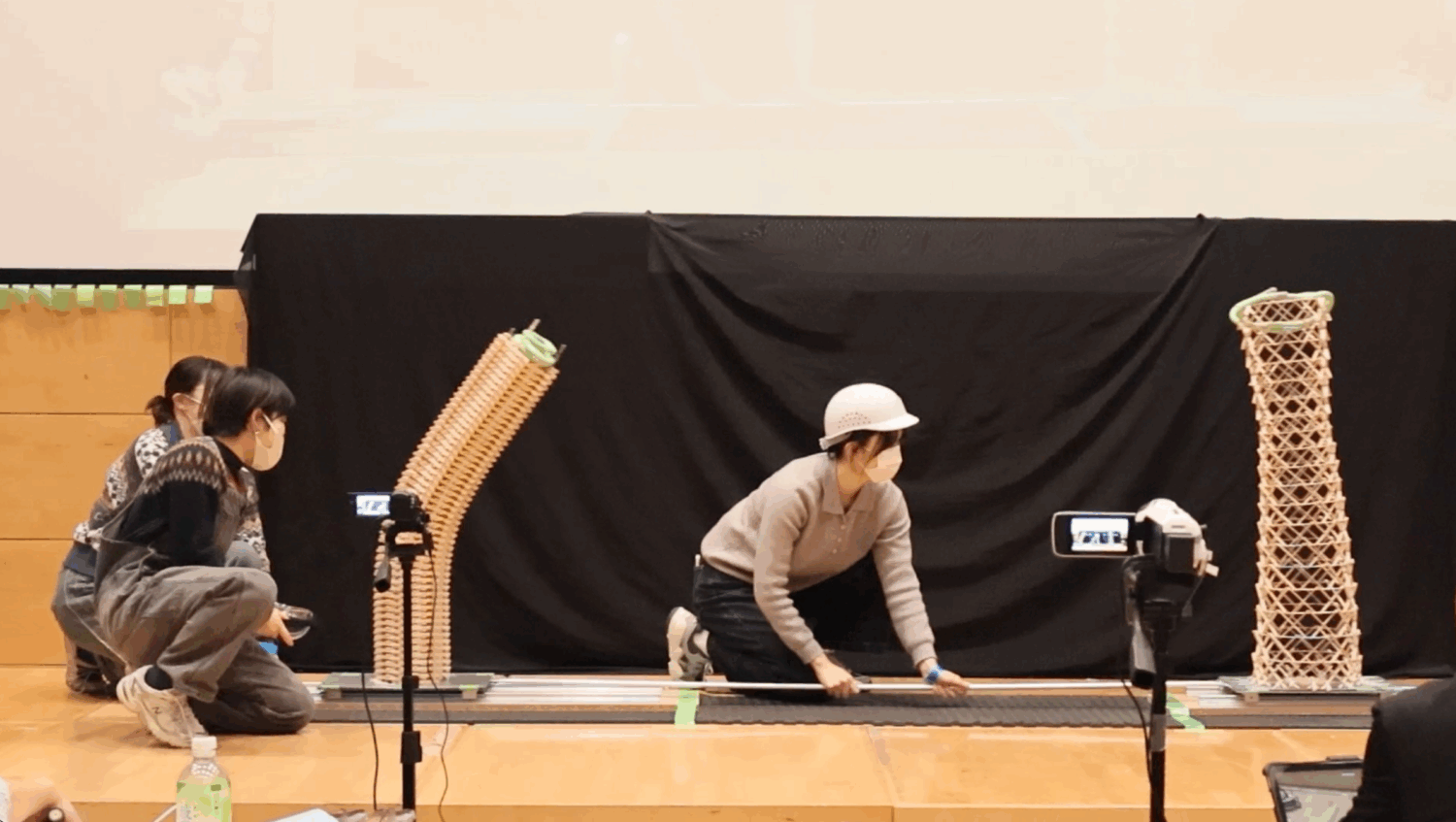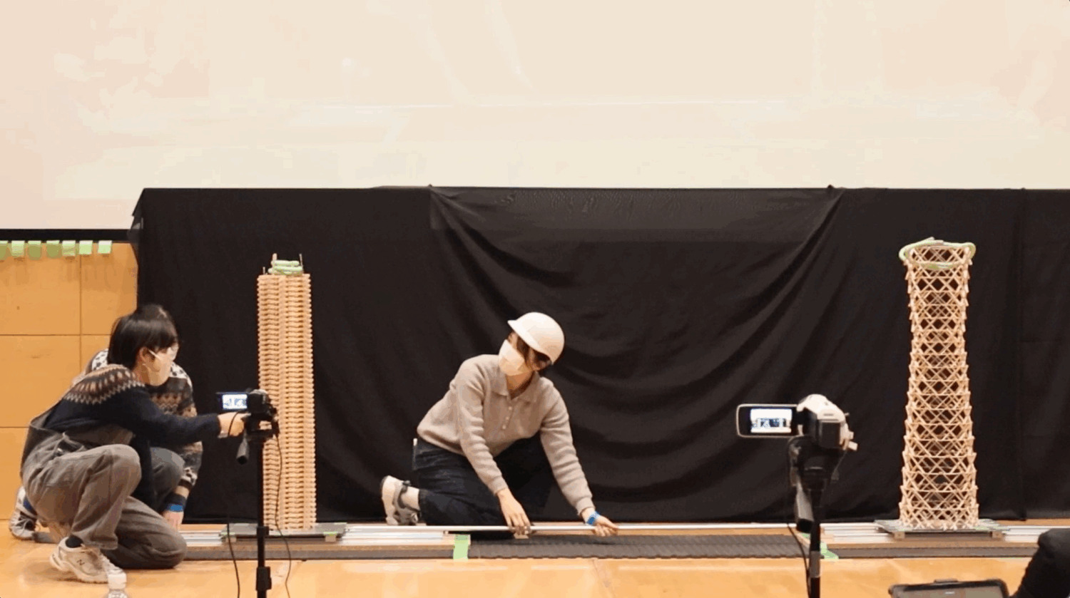 この模型を対戦相手と同じ振動台の上に載せて15秒間揺らし、耐えることができるかを比べます。1回耐えられたら、揺らす人を変えてもう一度15秒間揺らします。