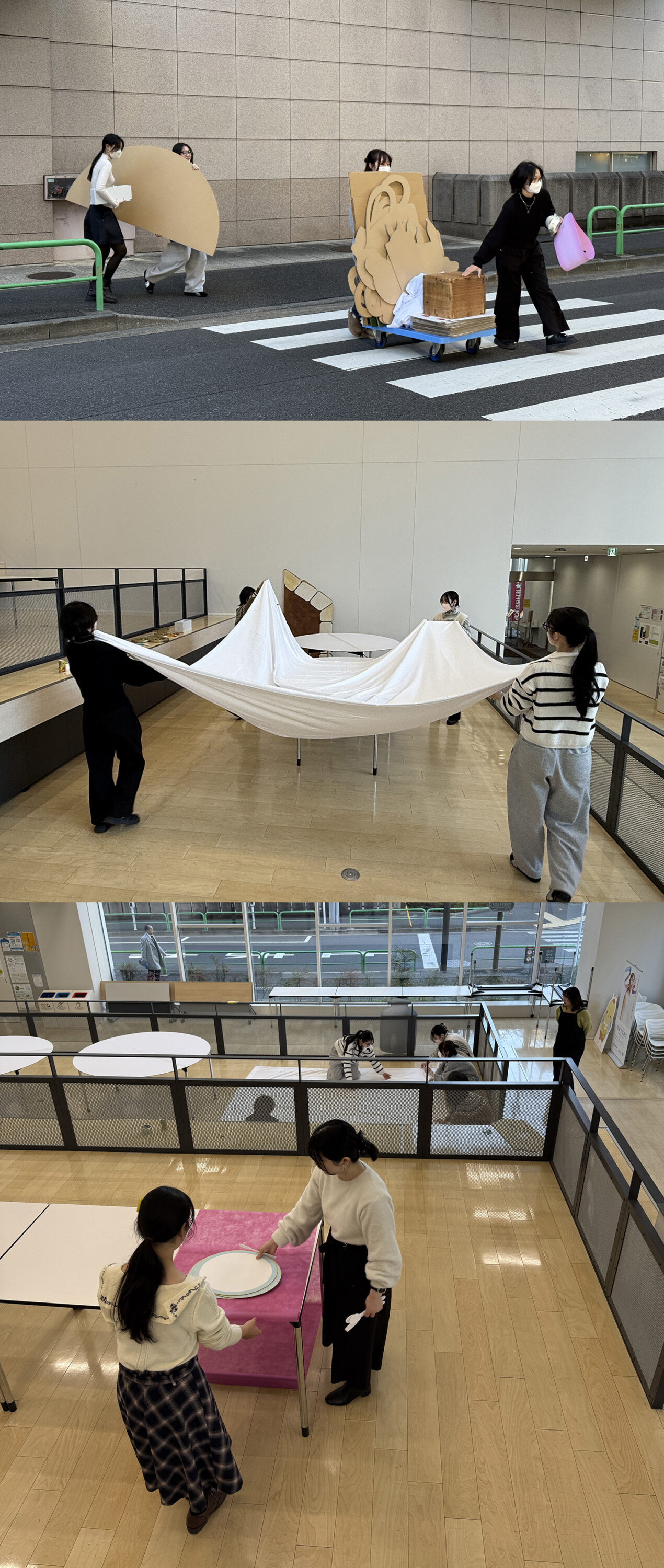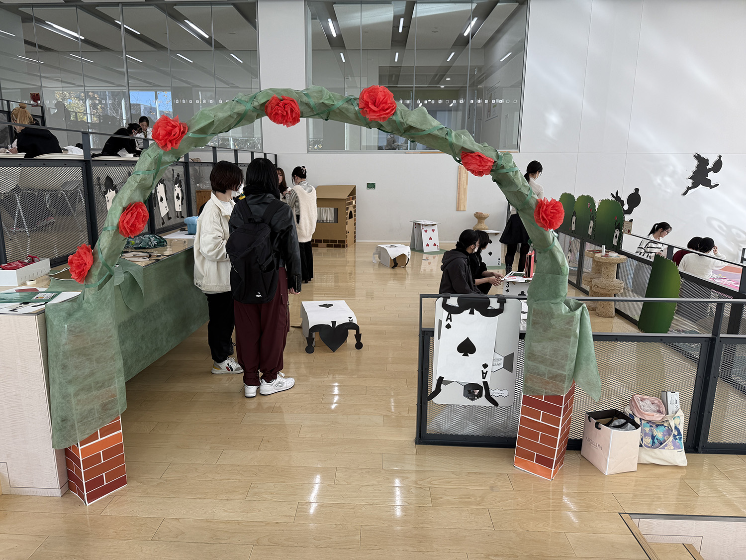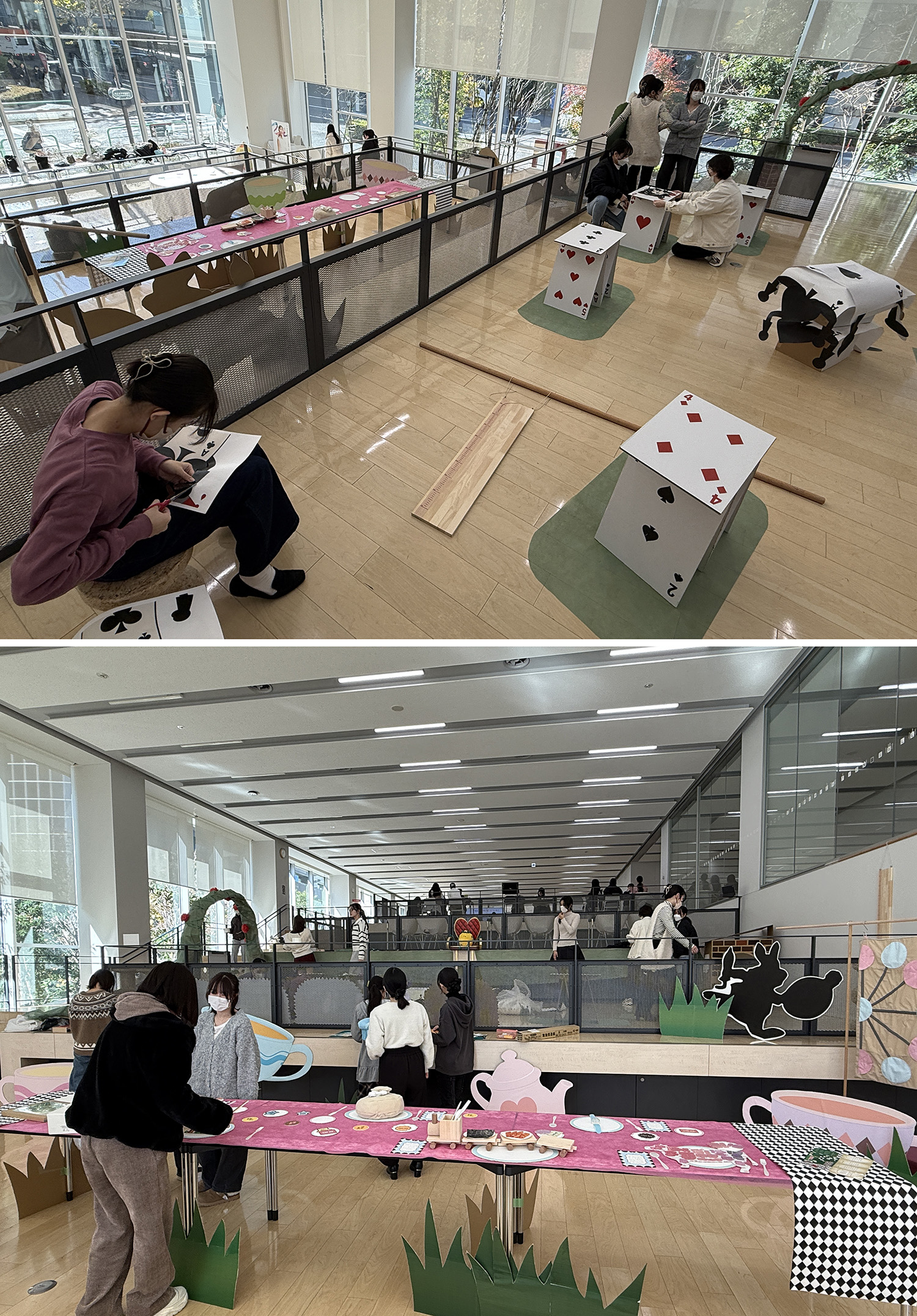 今年のテーマは「Lost in Wonderland」不思議の国のアリスをモチーフに、みんなで話し合いながら空間デザインを行って本日搬入と設営を行いました。