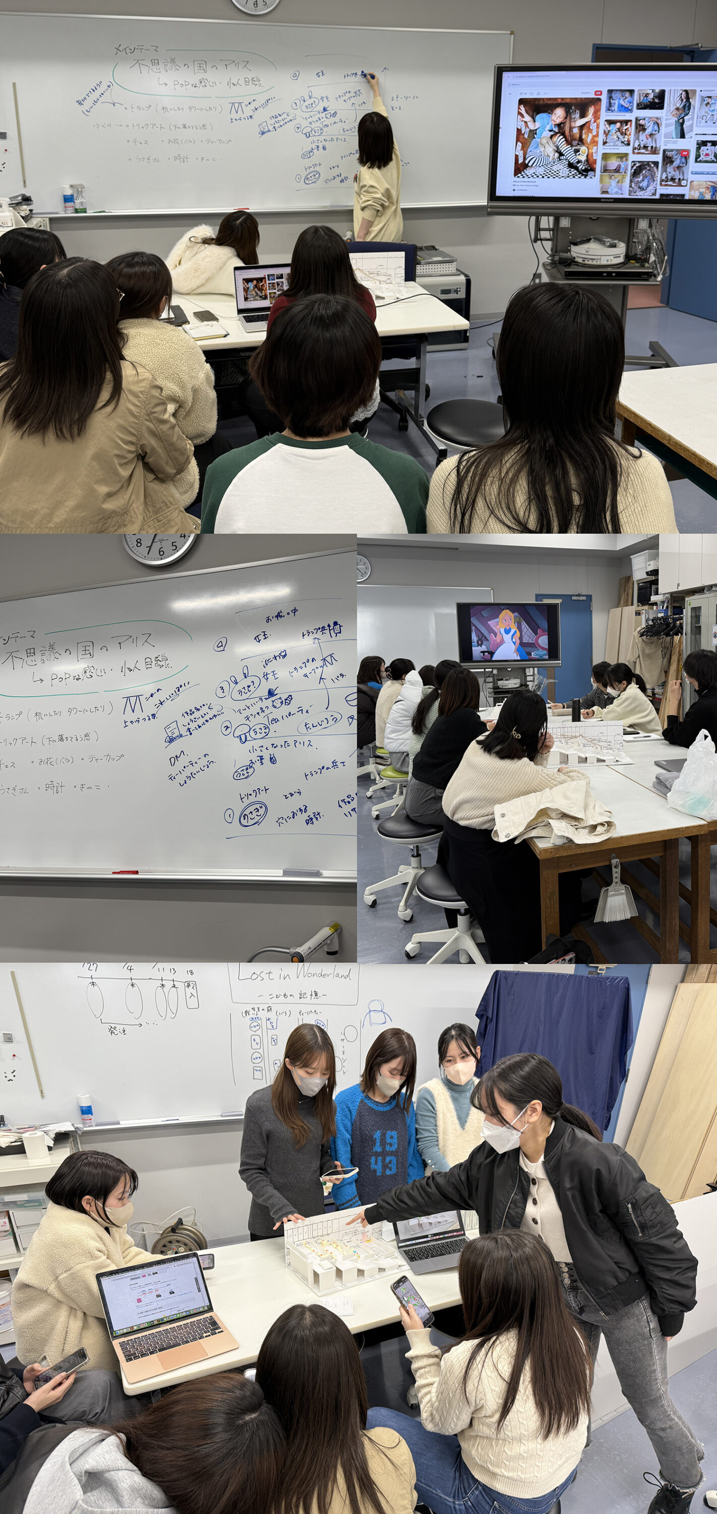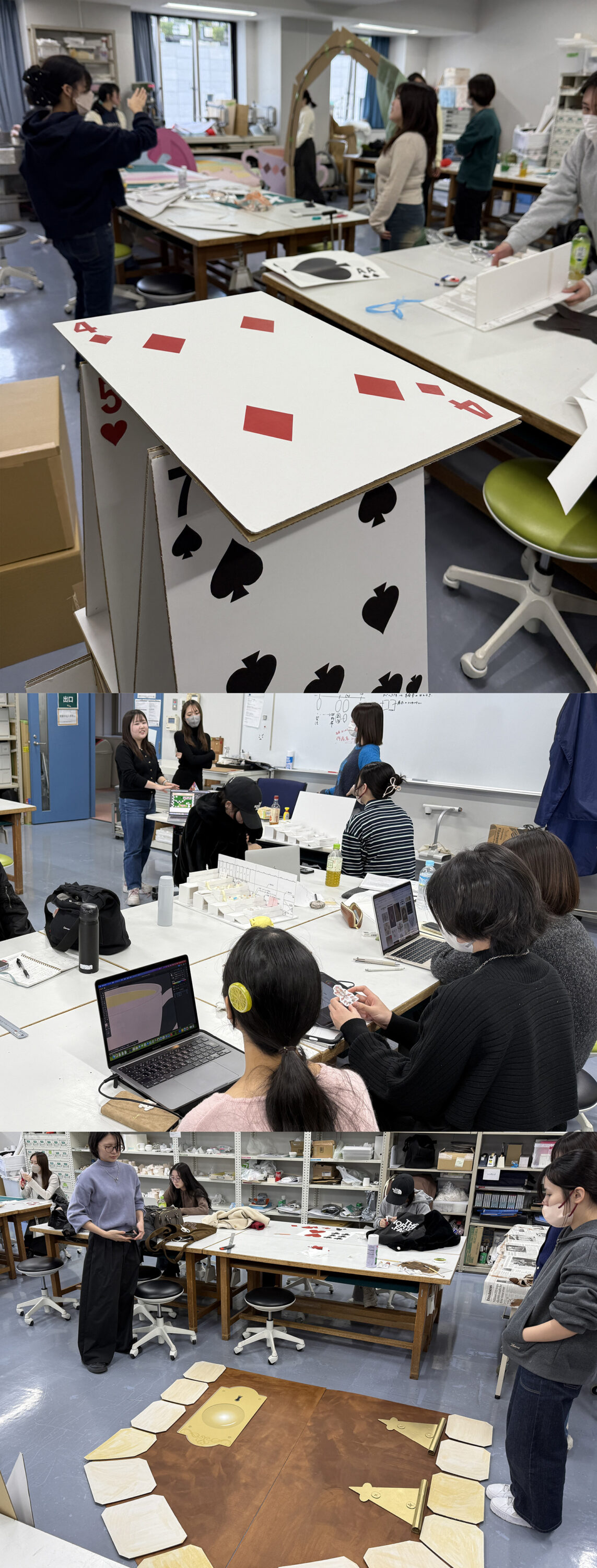 2年時に分野が別れ、素材、機能、使用エリアと演習課題を行なって、IVでは対象年齢、そして空間デザインまで学びます。初めに対象年齢のリサーチをまとめ、個人作品のテーマを各自で設定しデザインワークを行います。その後、それらの作品を展示発表する空間デザインを全員で進めていきました。