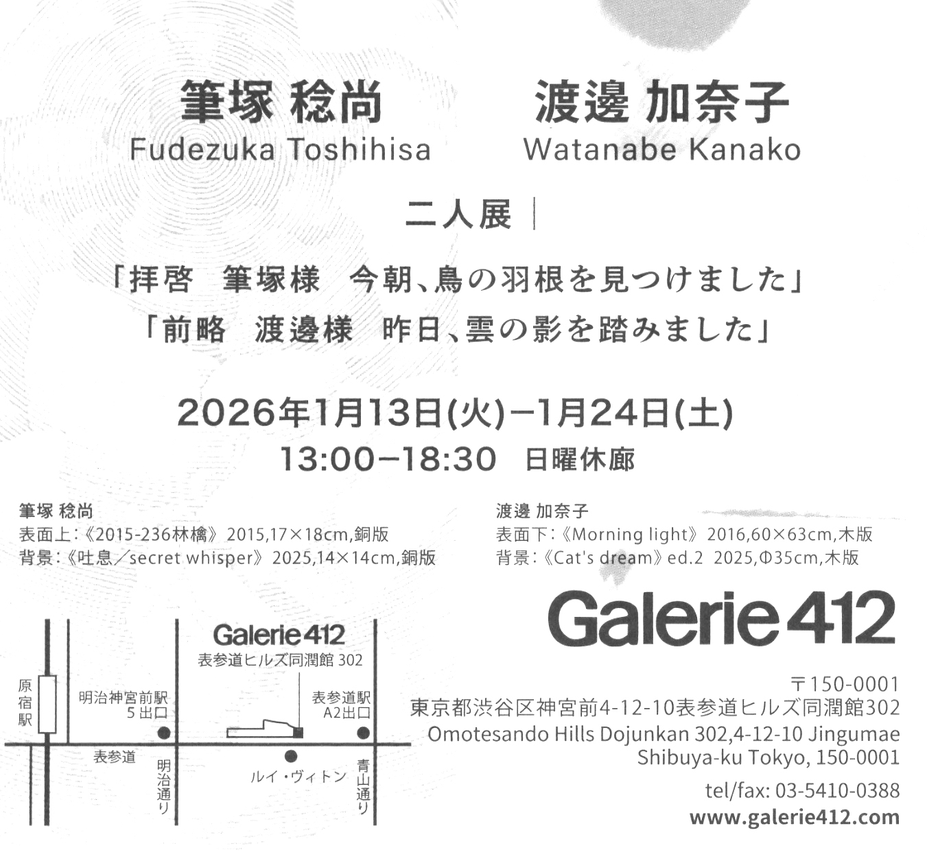 1月13日(火)から、筆塚稔尚さんとの二人展をGalerie412で開催していただきます。年明け早々、すてきな空間で展示させていただけること、とても有難く、嬉しいです。多くの方にご覧いただければ幸いです。どうぞよろしくお願いいたします!