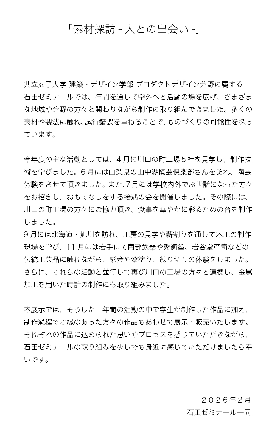 石田ゼミ1年間の活動記録展です。共立リーダーシップGPから支援を受け、ゼミのグループ活動に活用することで実現しています。年間を通してお世話になった各地域の職人や作家の方々の作品と共に、学生がグループ活動で生み出した作品や個人作品なども展示いたします。今回は作家のみなさんの作品に加え、学生のオリジナルデザインの時計も実際に販売いたします。